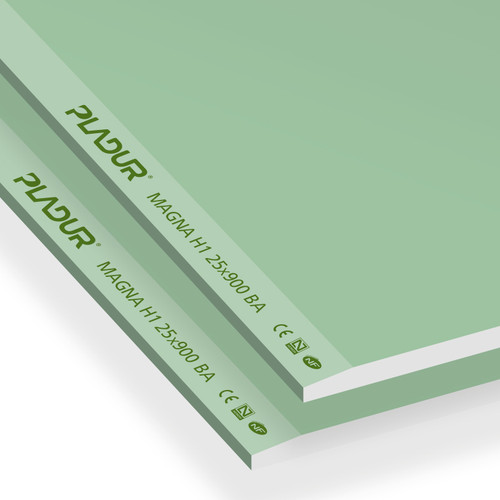 Placa Pladur Magna H1 25 Placa de yeso laminado con alma de yeso natural y láminas de celulosa. Tipo I, H1 (EN 520:2004 +A1:2009), baja absorción de agua, alta dureza, resistencia al fuego. Espesor 25 mm, ancho 900 mm, color verde, bordes afinados. Comparar Añadido Comparar